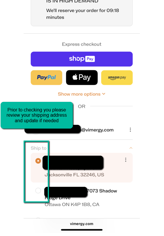 Prior to checking out, the cart will show you the shipping address. Please review and update if needed before checking out.
