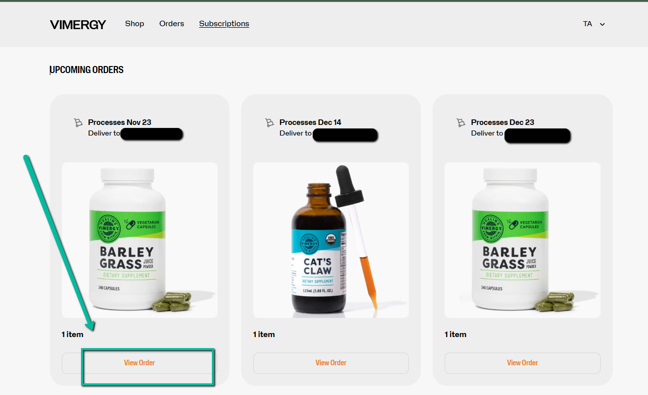 If canceling by Order - click on View Upcoming orders. Select the upcoming order you would like to edit/cancel.