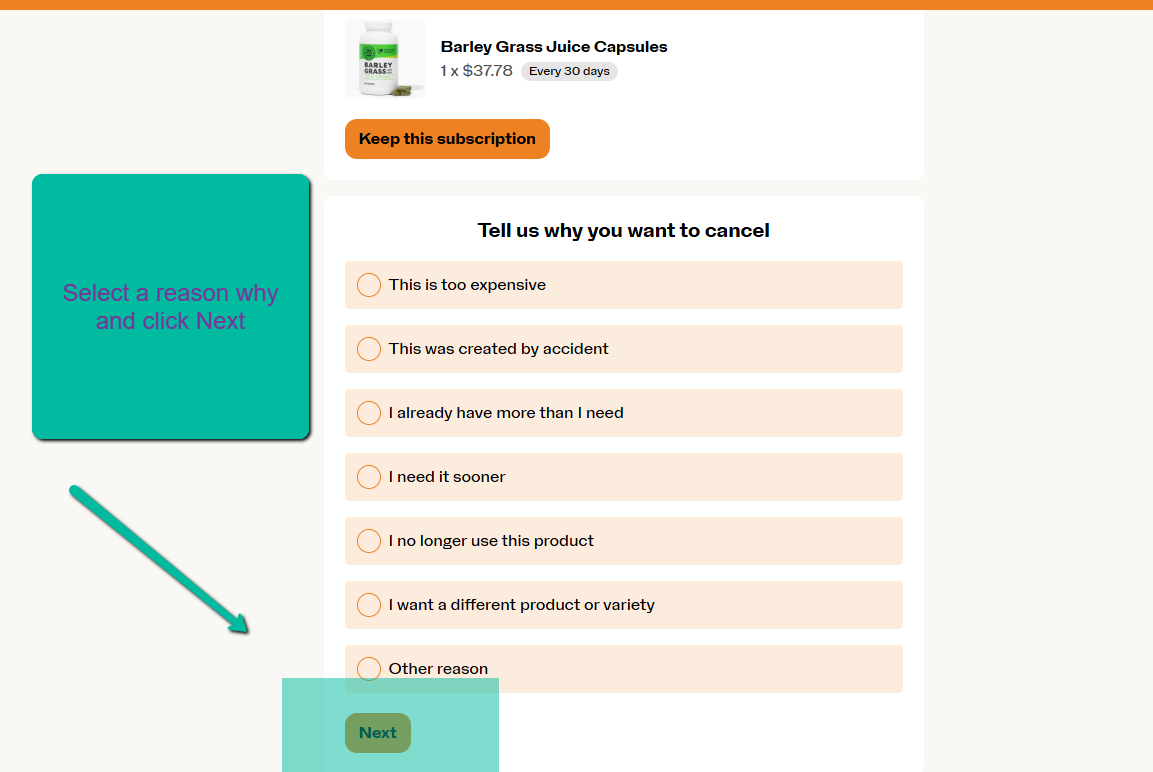 You will then be redirected to confirm - select a reason why and click Next.
