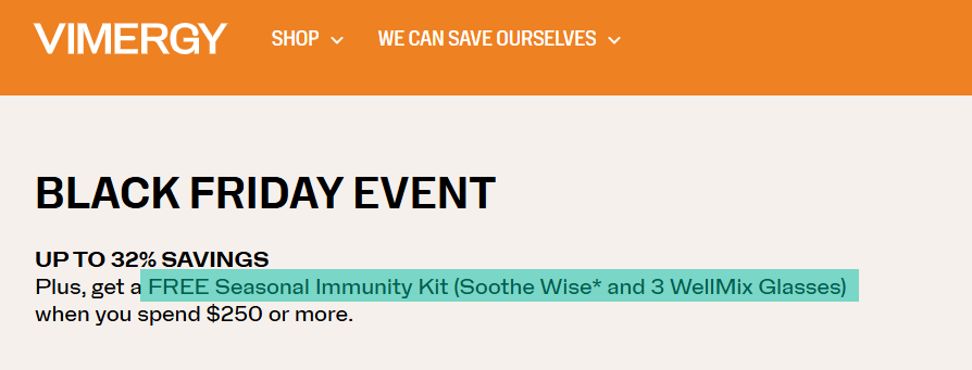 Terms and Conditions Apply. Offer valid November 20, 2025, to November 28, 2025. Customers will receive a discount of up to 20% on all Mix+Save eligible packs and 15% on select Refill & Value packs. Customers who spend $250 or more will receive a free Seasonal Immunity Kit (Soothe Wise* and 3 WellMix Glasses). Seasonal Immunity Kit is available in limited quantities and will be automatically added to eligible orders on a first-come-first served basis. Discounts and Free Seasonal Immunity Kit are applied at checkout. Mix+Save offer applies to Full-Size packs (discount % varies based on number of unique Full-Size packs included in the order); Mix+Save discount is not applicable on Travel, Refill, or Value packs, or Kits. Mix+Save discount may be stacked with Sign Up+Save for a total of up to 36% savings. Discount cannot be combined across multiple orders. Offer only valid at vimergy.com, vimergy.co.uk, or vimergy.eu. The offer does not apply to scheduled subscription orders. Offer not valid at any other store that carries VIMERGY products. Not applicable on previous purchases. No price adjustments. Additional terms and conditions may apply. Offer valid while supplies last, no rainchecks. Not applicable on previous purchases. No price adjustments. Additional terms and conditions may apply.