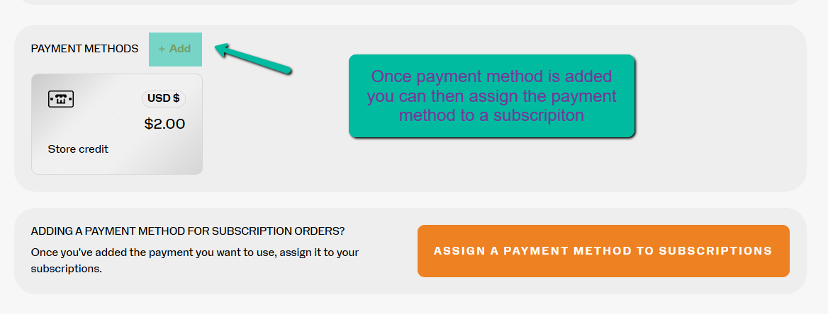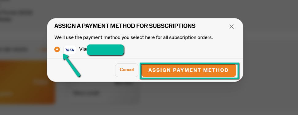 Now that a payment has been added, select Assign a payment method to Subscriptions.
